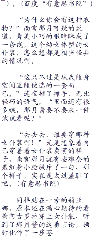 因为,,真的很奇怪啊,竟然让吸血鬼的王者,阿古罗拉穿上了女仆装什么的。况且,随身携带女孩子的衣物什么的,说得好听一点叫做贴心‘暖男’,说得难听一点,那不就是变态绅士(hen~tai~)嘛,考虑到连夜还刻意收集了阿古罗拉这种幼女体型的女仆装,倒不像是一个暖男,更像是绅士(hen~tai