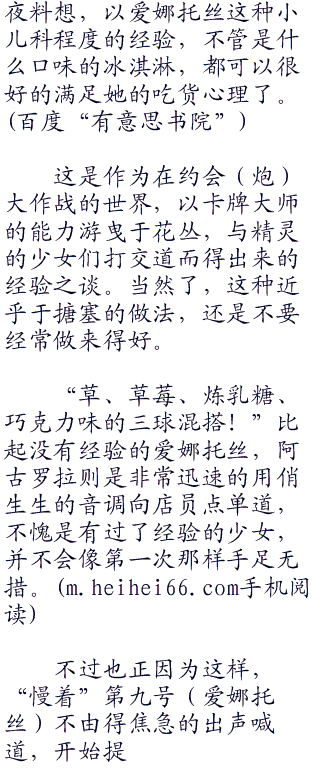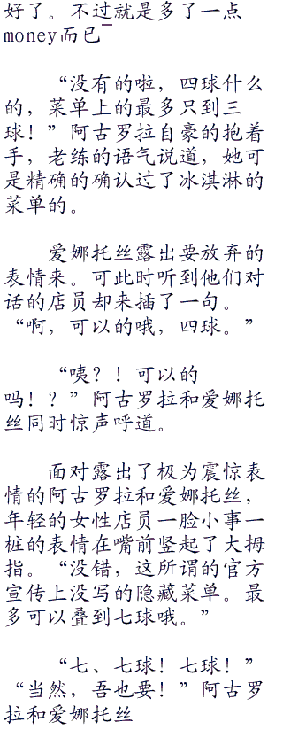 在‘睡美人’公主阿古罗拉身上完全感觉不到什么玉wang跟执着之类的东西,但唯有甜品是例外,特别对于鲁鲁家冰淇淋异常地执着,不过这样子说起来,第九号(爱娜托丝)甚至比起阿古罗拉来说,对于冰淇淋甜品的执念更甚。