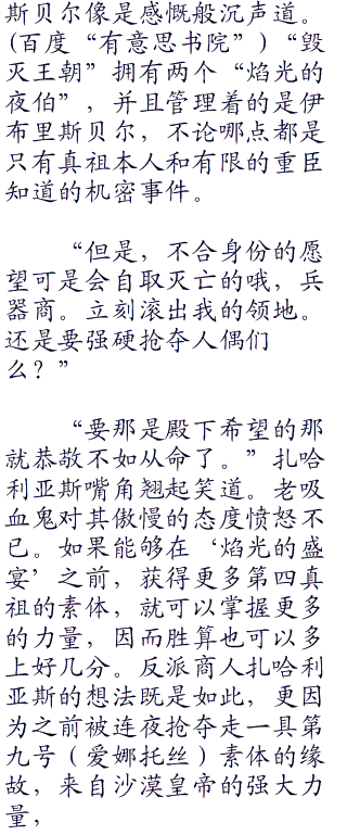 对于身为王族的伊布里斯贝尔来说,最切身的威胁不是他**队,而是其他的王族亲属。过去曾数度被设计,但每次都被伊布里斯贝尔击破。恐怕这次也是第二真祖直系姐弟之中的谁派了暗杀者,这样考虑想来比较妥当,但是,