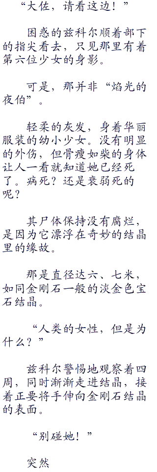 “将从伊布里斯贝尔王子那抢来的‘焰光的夜伯’(kaleidoblood)交出来,返还给‘毁灭王朝’!”兹科尔说道。