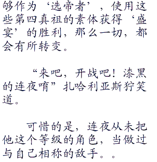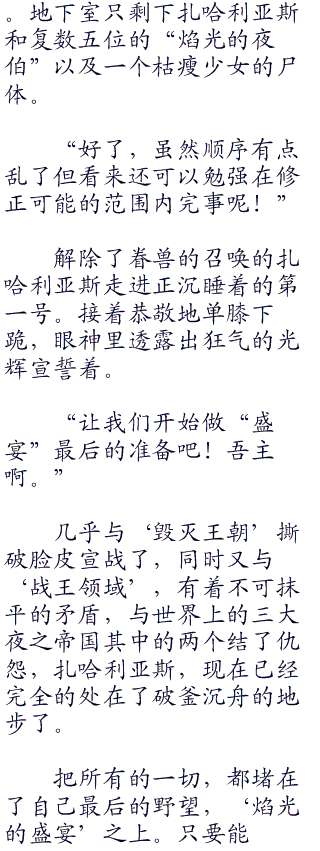“啊,这个啊。真是的,被破坏得这么严重的话只能重新整容了呢。否则用这副乳臭未干的面容做生意的话会被对方小看的吧。”摸着满是血的脸,身板纤细的男子苦笑道。这语气毫无疑问是扎哈利亚斯,本应该被兹科尔打爆了的面庞,却返老还童地复原了。