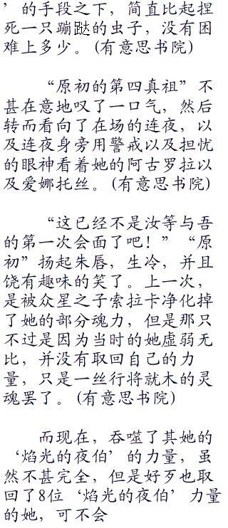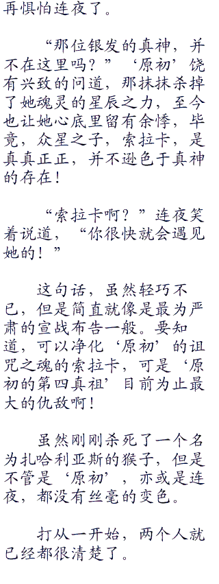 “肮脏的俗物啊。对于强大的吸血鬼真祖力量,汝想必相当地羡慕嫉妒恨吧,想着让本来拥有着强大神性的古、丝塔复活,让吾附身,从而控制第四真祖的力量么?你觉