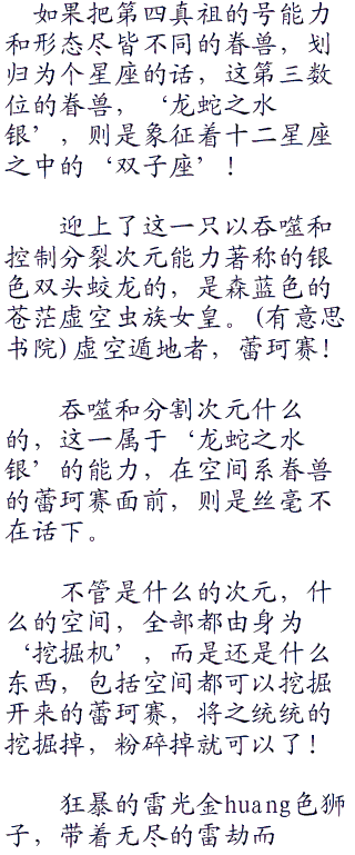这才只是三只眷兽而已,而‘原初的第四真祖’,可还是有其它的5只强大眷兽的啊!更何况,第十一号的眷兽‘水精的白钢’,这只水之妖精,还具有着治愈的能力,既有奶妈又有战士和输出,这才是一个眷兽队伍的标配啊!