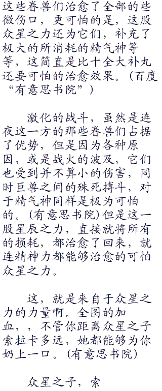 星河灌注的银芒,散落在场的,每一只连夜、阿古罗拉以及爱娜托丝所操纵的眷兽的身体之上。