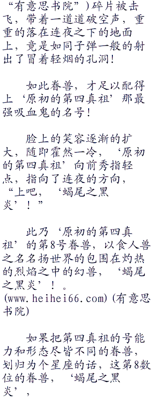 如同堕落天使一般的‘原初的第四真祖’,拔下了倒数第二根的羽翼,那是一条极光色的美轮美奂翅膀,最终落下,辗转化作了具体的眷兽形态,那是一只浑身都包围在灼热的烈焰之中的怪兽。
