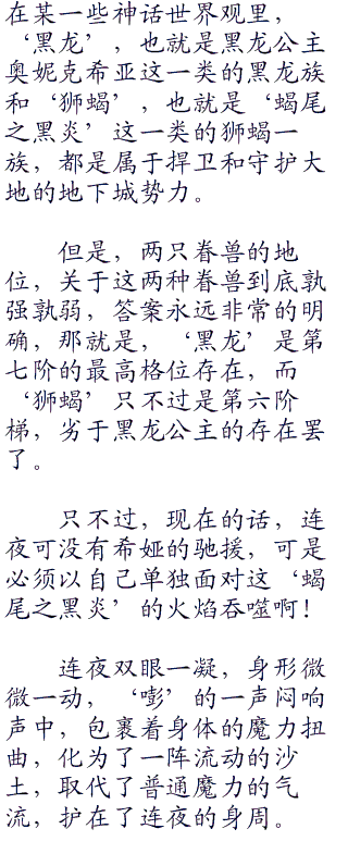 鲨鱼的牙齿,狮子的身体,蝎子的尾巴,漆黑的蝙蝠翅膀,如同恶鬼一般的身体纹路,这只幻兽以食人兽之名名扬世界,乃是地下城里吞噬人的恶兽,‘蝎狮’或者说是‘狮蝎’是也。