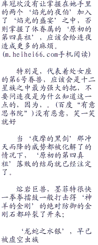 说起来,第四真祖的十二体眷兽,分别代表了个的星座,但是现在呈现在连夜眼前的,就只出现了体眷兽和所代表的星座罢了,还有着代表着处女座和摩羯座的第6号和第号素体‘焰光的夜伯’尚未出现过。连夜或许应该庆幸嘉妲