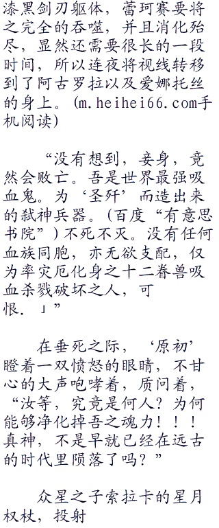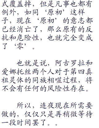 虽然可能有些对不起即将继承第四真祖力量的阿古罗拉和爱娜托丝,但是连夜还是没有反对让蕾珂赛,吞噬掉‘夜摩的黑剑’,毕竟,这只能打能抗,并且任劳任怨的虫娘自然有权获得她的战利品。