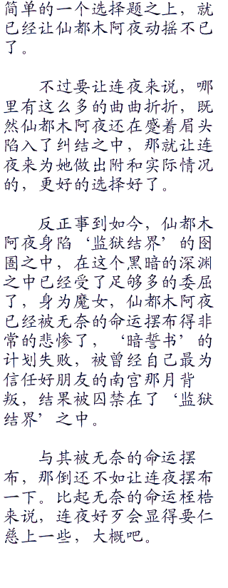 当然也不是因为连夜就因为看脸的缘故,就丝毫的不讲道理了。仙都木阿夜和南宫那月这两个魔女之间的矛盾,虽然相当的尖锐,但也不是到了不可调和的地步。况且,仙都木阿夜也不是那一种坏到了无可救药的人物,只不过是在魔女道路的选择之上,和南宫那月有着巨大的分歧罢了。