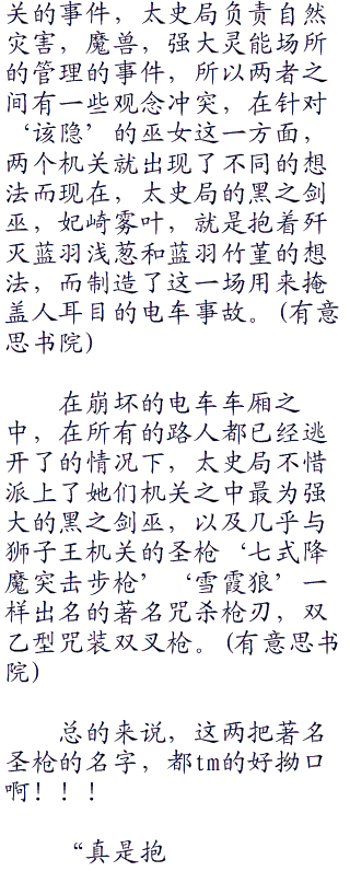 身材高挑的黑之剑巫秉持着一把双刃的长枪,轻巧的驻足抵在了电车车厢的门口。绝美的剑巫,却透露着泠泠逼人的冷淡杀气。