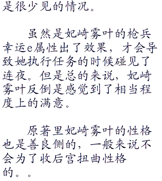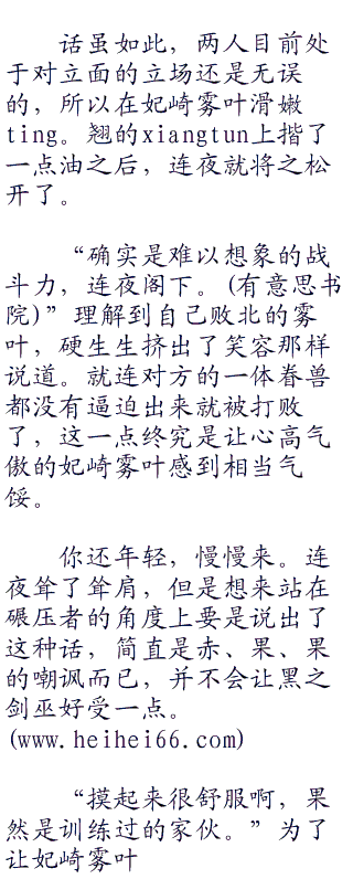 失去了任何制御敌人技巧的黑之剑巫,就这个样子傻傻的在惯性之下撞到了xiong怀大开的连夜的怀抱之中。连夜自然也毫不客气的借下了妃崎雾叶的‘熊抱’,顿时是一阵香风扑怀。