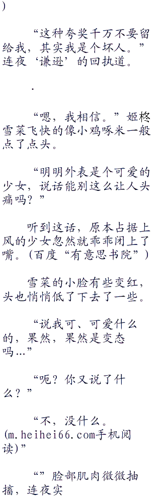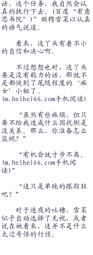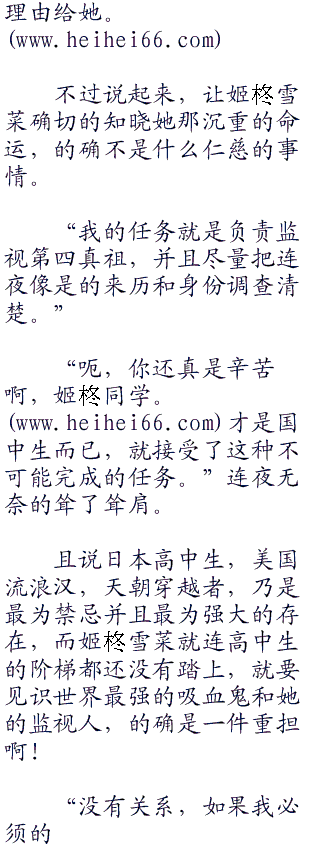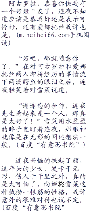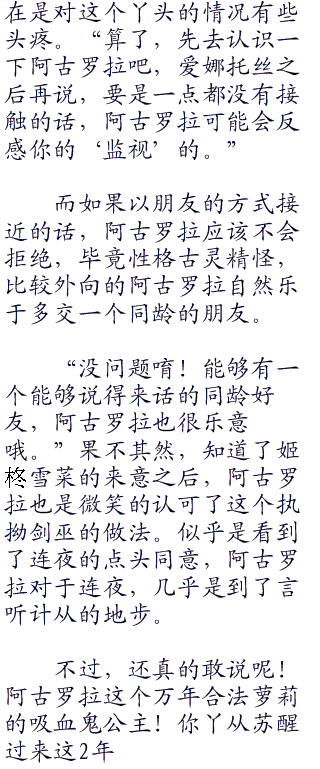 听完雪菜一本正经的话,连夜的嘴角微微抽搐。看起来狮子王机关并没有通告给姬柊雪菜真正的秘辛,而是胡乱的塞了个监视