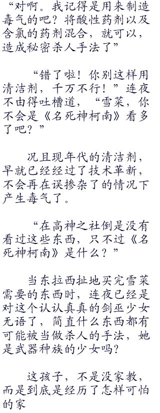 “请不要说这种失礼的话,连夜先生。很小的时候在高深之森,我就已经接受各种任务了。而且,我现在也是中学生了,并不是您口中的小孩。”