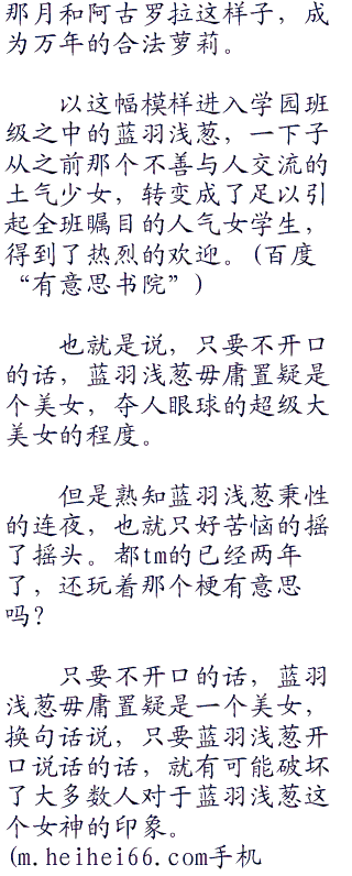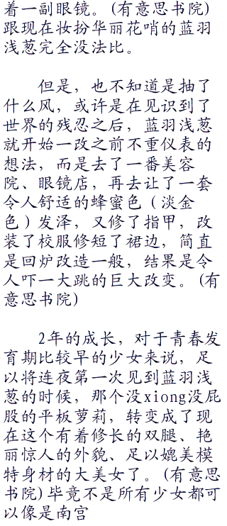 在连夜第一次碰到蓝羽浅葱的时候,那种打扮的她,真的就像一个土里土气的灰姑娘。俗气的马尾,还带