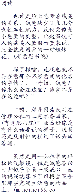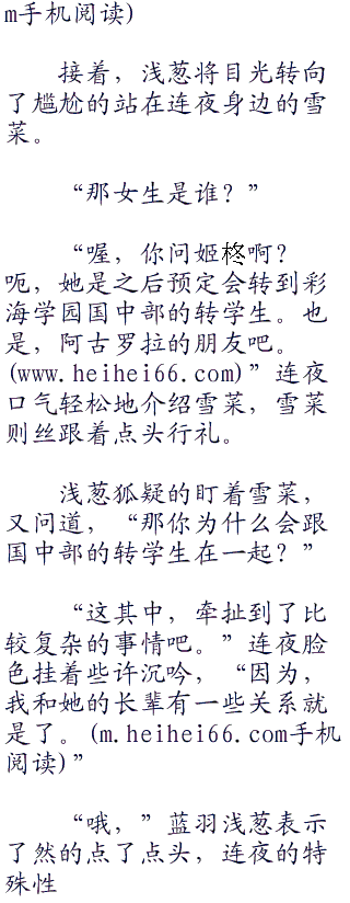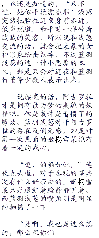 从后面向连夜欢快的招呼着手的,是一个容貌亮丽吸睛的高中女生。那是一个熟面孔,蓝羽浅葱。