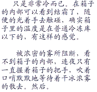 那是一个沉重的金属箱子。重量应该近百公斤吧。虽然说要是让身体强化了许多的召唤师连夜来搬运它是一件相当简单的事情,但是事实上,这一件行李是相当难以搬运的国际邮件,以至于送货员的快递小哥一把这东西仍在了空地上之后,就慌不择路的跑上小型卡车离开了。