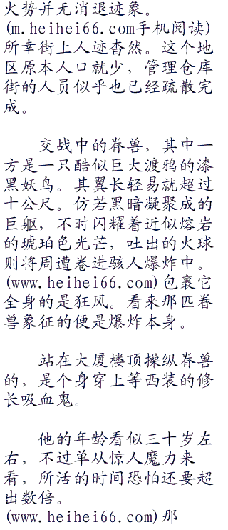 今夜的魔族狩猎案件发生在无人的仓库街,因为眷兽的肆虐,这里四处发生了大规模火灾。街灯熄灭的街道被熊熊燃烧的火焰照耀成整片赤红。自动灭火装置也在运作,但
