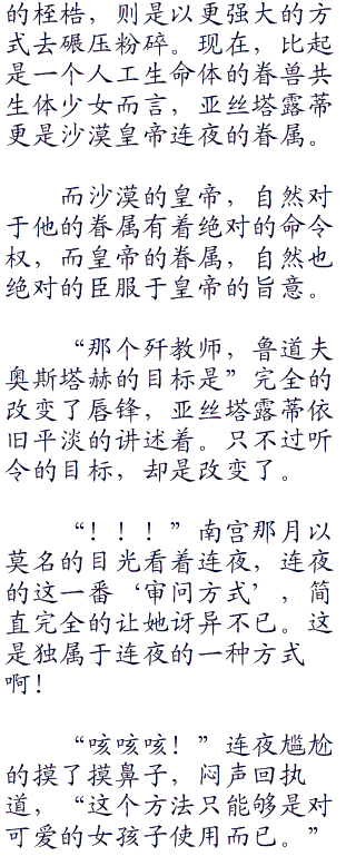 “我服了。”南宫那月摇了摇臻首,举手投降道。这个名为‘亚丝塔露蒂’的人工生命体,看起来倒是脸色淡漠,体态轻巧,但性格却是偏执硬刚得不行,即使是对于审问颇有研究的‘空隙的魔女’,对这个二愣子的人工生命体也是没有辙。