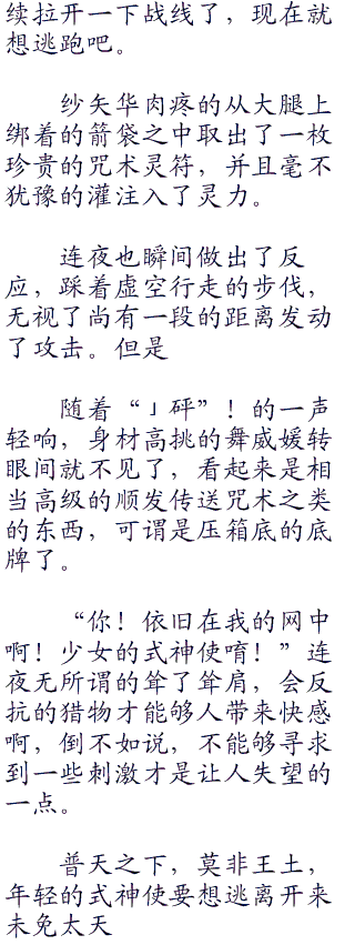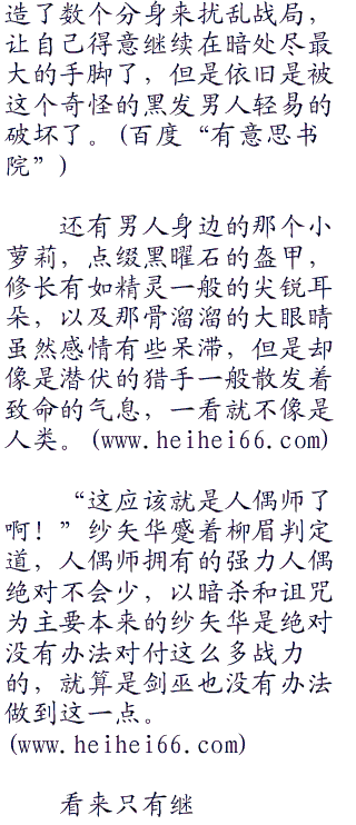 对于以咒术分化出来的分身被一并剪除了这一件事情,煌坂纱矢华并不感到惊讶,竟然名为‘人偶师’,那么自然不可能指示单单一只的战斗人偶,恐怕还有更多复数位的人偶好整以待着。
