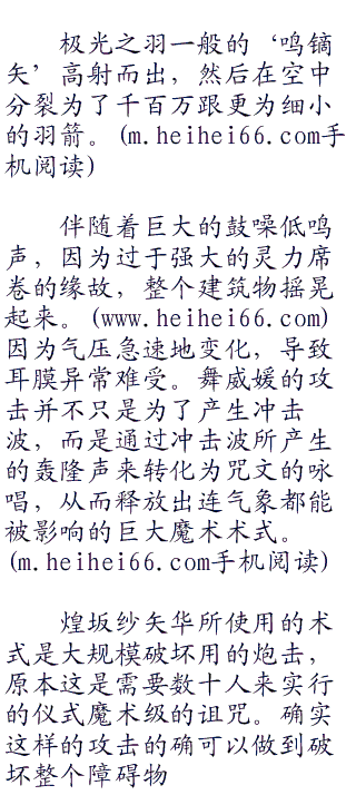 “机会只有一次,但是正合我意!”纱矢华卷起裙角,从绑在大腿上的套盒里拿出了金属制的镖,并在右手里延伸成了一支弓箭。