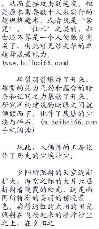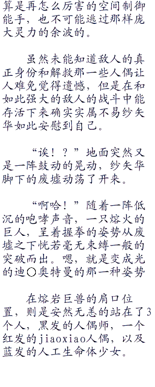 而现在,煌坂纱矢华打算使用压箱底的绝招,将那个外表光鲜但是金玉其外败絮其中的肮脏人偶师送进地狱之中。反正她的师父在一开始执行任务之前也已经说过,就算是杀了人偶师也没有问题。