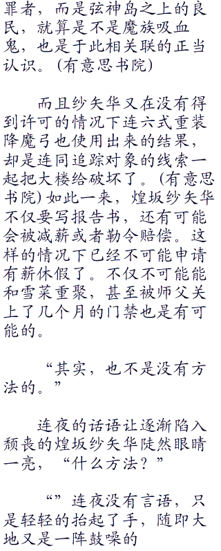 “啊?什么其它的事情?”煌坂纱矢华差一点跳脚起来,本来就因为可能来自于师父的惩罚而担忧的她,看到连夜这一番诡笑,更是噤若寒蝉,看起来怪可怜的。