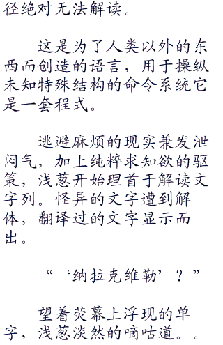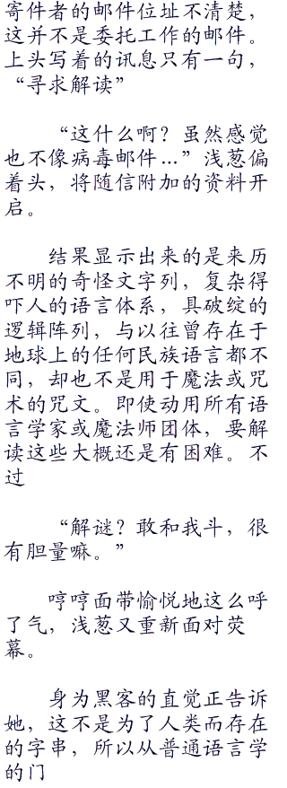 “沙(杀)老师,哦不,连夜最近的样子,总是很奇怪啊,像是很分神什么的。”长叹了一口气,蓝羽浅葱向身旁端坐着的姐姐,蓝羽竹堇抱怨道。