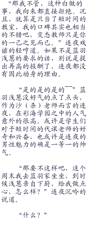 当初‘黑死皇派’在弦神岛上鼓捣小动作的时候,连夜没有动作,因为他在和南宫那月正在月夜之下**;后来‘黑死皇派’通过‘海神之墓’号游轮运载秘密物件到达弦神岛的时候,连夜也没有动作,因为那个时候他正在处理煌坂纱矢华的事情;后来‘黑死皇派’正在破译驱使‘纳拉克维勒’的密码的时候,连夜还是没有动作,因为他正在忙乎着和蓝羽浅葱之间的小事情;再接下来,‘黑死皇派’已经几乎掌握了如何驱使‘纳拉克维勒’的时候,连夜仍然保持着无所作为,因为他还有那么多妹子需要去处理,哪里有时间陪几条疯狗玩。