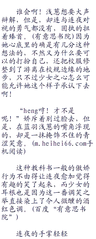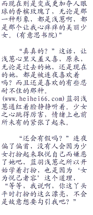 蓝羽浅葱现在就有这一种顾虑,刻意的翻阅最新的时尚杂志,把自己从一个小小的灰姑娘,俗气的黑色马尾,还带着一副土气的眼镜到现在变成了特别俏丽吸睛的少女,亮丽的发型、妆点程度游〇于校规边缘的制服,就连发色都换成了蜂蜜(淡金)色。这种改变只是为了让自己更加能够引人注目,能够引得连夜注目罢了,但是如果弄巧成拙,反而是被讨厌了,那就不得不说是一种极坏的改变了。