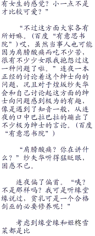 而且,连夜的目光则在无意识间飘到微微破碎的水手服前襟底下露出的xiongkou雪白。“这这个嘛,如果和姬柊比,是不算小啦。”略微迟疑了一会儿,连夜开口说道,拿和纱矢华一起长大的雪菜来比较最为恰当了。