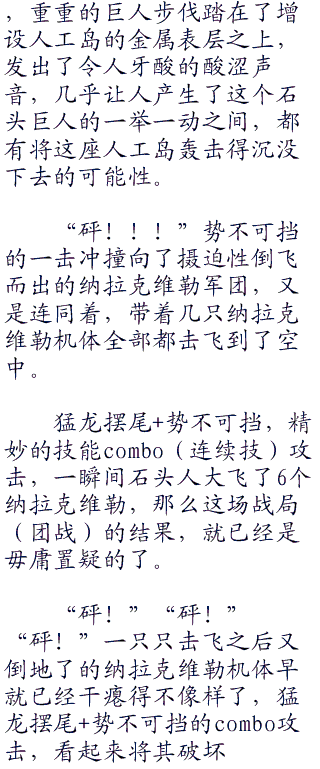纳拉克维勒有着能把来自外部的攻击学习,使自身的性能进化,从而免疫之前所受到的攻击的能力!同时还能在受到损伤以后,将周围的物质元素进行变换,从而自动修复自身的机能!简而言之,纳拉克维勒简直就是一架无法破坏,