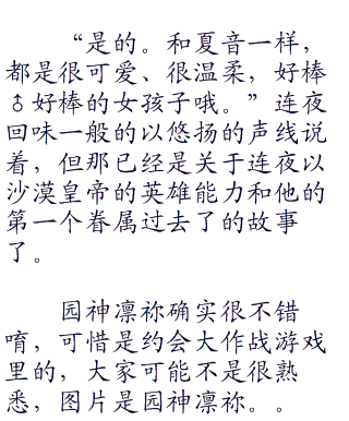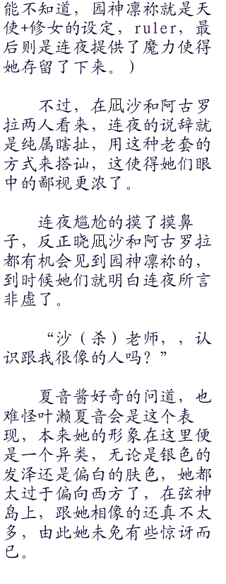 但说是平平淡淡的,是因为她和其他的男性很少讲话,唯有和晓凪沙、阿古罗拉等少数人有来往而已。看似好像是备受排挤?事实上叶濑夏音自身都没有意识到自己的人气有多么的高,没有男生敢主动和叶濑夏音谈话的原因,是因为夸张到了谁敢主动和她攀谈,就会让其他的男生愤怒不已,叶濑班上的男生要是主动找她讲话,听说会被罚钱。