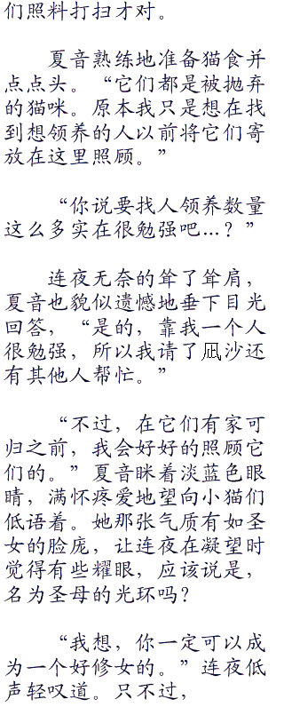 她的包包里有猫咪喝的牛奶罐,猫食及玩具等。照顾一只小猫咪,这样的行李几乎有些大费周章,应该是说太过善良了吧,叶濑夏音在过去的修道院之地收养了十几只小猫咪,明明夏音酱本身,就像可怜的流浪猫一样颠沛流离,让人感到怜惜。