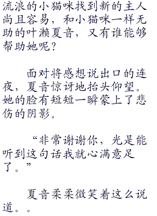 “往这边走就行了,小猫咪就在那边。”叶濑夏音棒起摆在脚边的提包这么说道。
