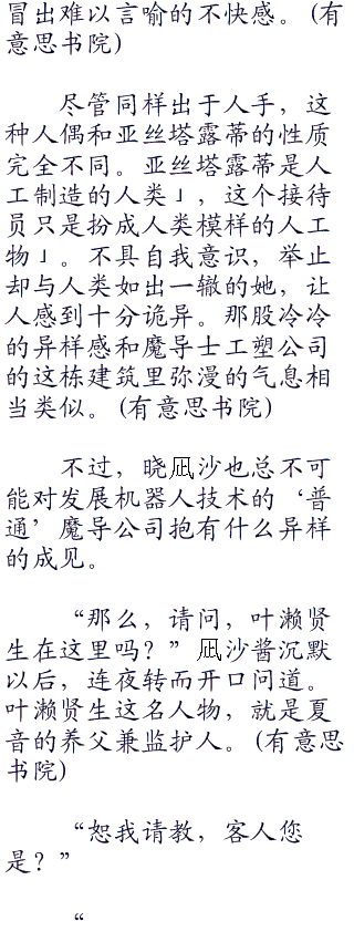 连夜他们一进玄关,柜“零零零”台就有年轻女性出声招呼。异样的气息使得连夜很快就发觉对方并非人类。她是机器人仿造人类做出的机械人偶。