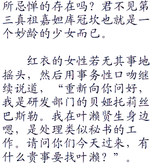 接待员用不带情绪的眼睛仰望着连夜,一边作势操纵手边的电脑,一边淡淡的用机械音回答道。“二〇四号室的叶濑夏音,目前外出中。”