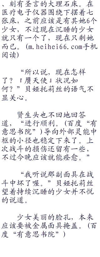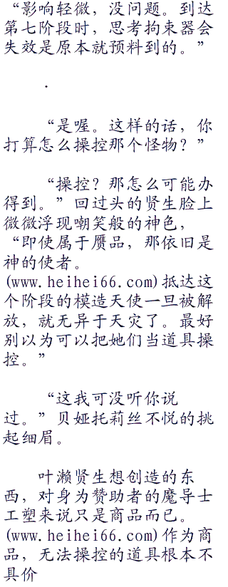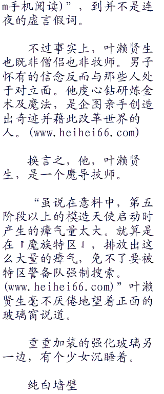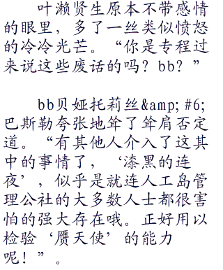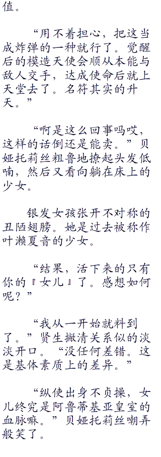 “这艘实验船还是一样没情调,餐点又难吃,亏你能窝在这种地方。”贝娅托莉丝环顾着被叶濑贤生称为祭坛」的实验室,缺乏感慨地说。