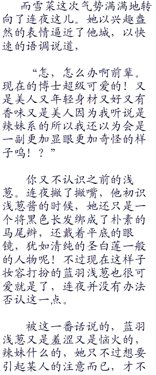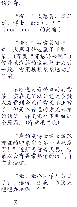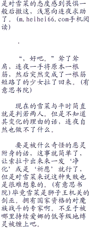 使得南宫那月和连夜同时产生了违和感的原因,是姬柊雪菜那有些异样优秀胸部的尺寸。与纤细华美的体格不符,胸部的隆起特别地显眼。记得胸部没有大到能够像那样爽快地揉吧。连夜突然感觉自己的记忆,仿佛出现了偏差值一般。明明之前是嘲讽过作为剑巫的两人,缘堂缘和姬柊雪菜都具有相似之处的平胸呢!