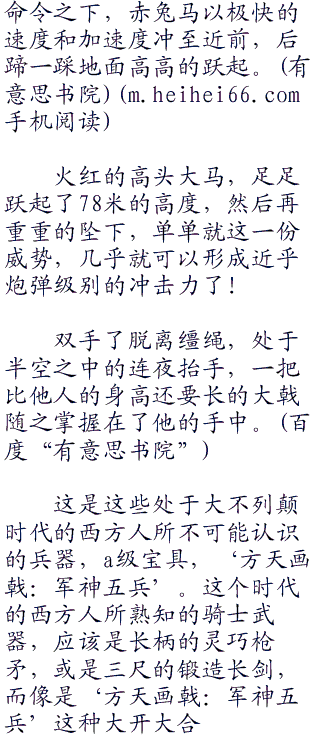 “就当是,,用来试一下这‘赤兔’的威力,和‘方天画戟:军神五兵’的力量吧”连夜轻声的说着,随即驾驭着赤兔马从相隔千米之远的山坡之上冲了出去。
