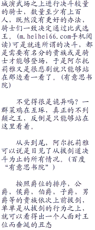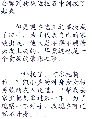 所以最后那些尴尬的骑士们,撇开了‘选定王者之剑’,选择了以决斗的方式来较量出其中的最强者。既然没有人能够拔起‘石中剑’,那么只有通过决斗裁决出来的最强者能够服人了。