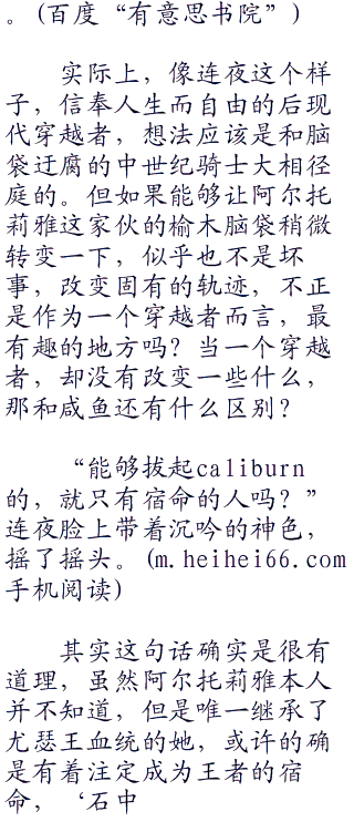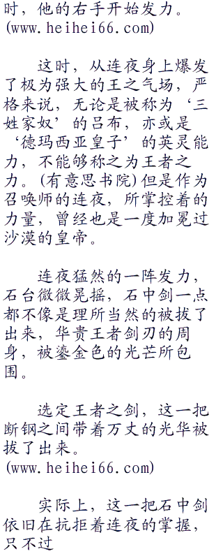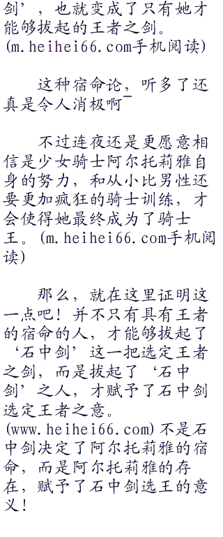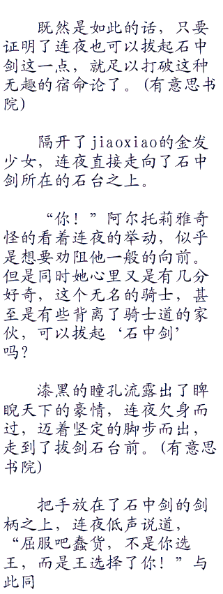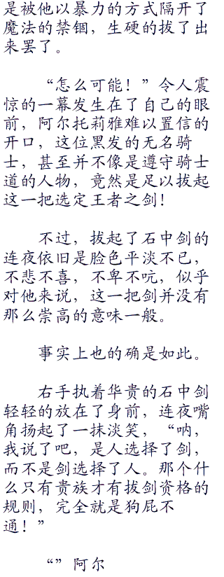 此外,还有令连夜头疼的一点,就是少女那高度的自尊,不服输并且好强的性格,因为她一向恪守的高傲骑士道,少女绝对是不会逾越选王的规则,而擅自拔起‘石中剑’的。