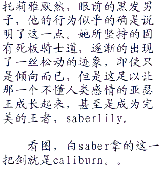 但是,所谓的规则,不就是人制定的而已,像这种愚昧的规则,自然是可以用来打破的。比起选王的规则而言,更加顽固的,是阿尔托莉雅的骑士之道。