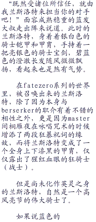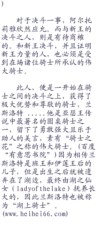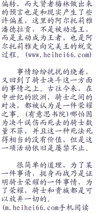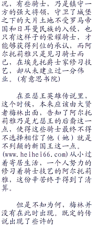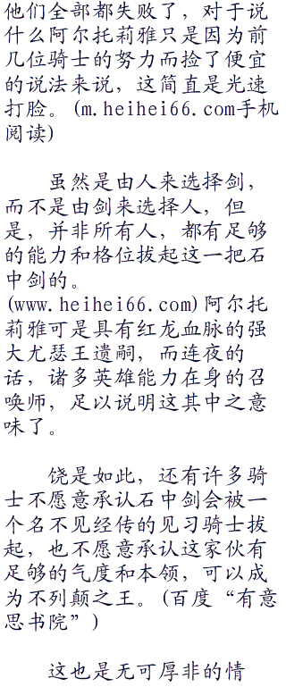 凌厉不服输的眼神扫过在场的诸位贵族和骑士,碧绿澄澈的眼瞳看起来看起来英气十足的‘少女’骑士,竟是以自身的气场压“零零零”制下了所有列位。实际上,无论是在骑士之道上,亦或是‘骑士七艺’方面的修习精湛程度,阿尔托莉雅都可以说是在在场的大部分贵族骑士之上的达者,一开始对于自己拔剑的不自信,只是因为吾王尚且没有成为王的意志罢了。
