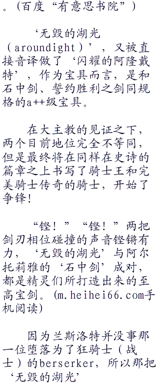 与拔起了石中剑的阿尔托莉雅相对的,这一把银白色的精灵大宝剑也是只有被歌颂为完美骑士」的兰斯洛特才有资格拥有,其名也华贵无比,‘无毁的湖光’那是比自报家门更能表明持有者真名的证据,‘湖之骑士’、‘完美骑士’,兰斯洛特