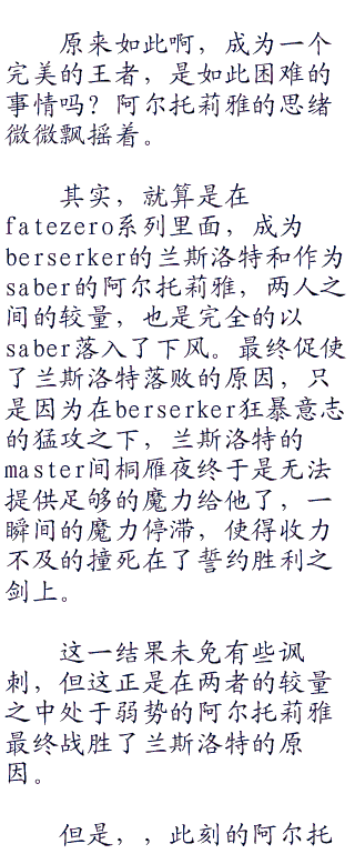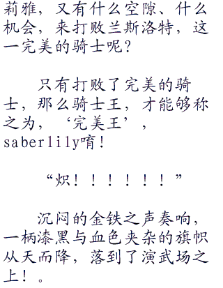 站在了演武场之上,阿尔托莉雅对面的骑士,名为兰斯洛特,那是一位被称为了完美骑士的存在,留下了勇敢强大且乐于助人的美言。