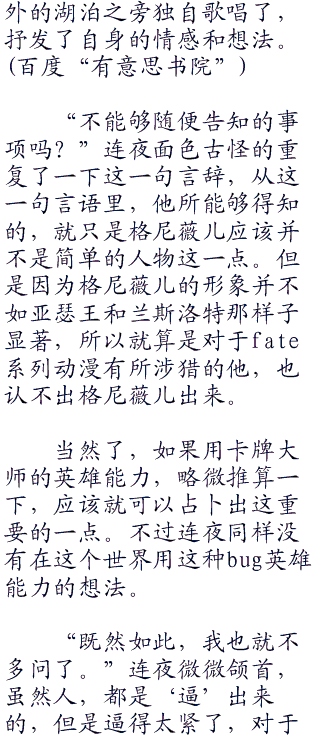 简单的致辞让格尼薇儿相当郁闷的心情稍微舒缓了些许,在听到对方夸自己的歌声好听的时候,格尼薇儿感觉自己甚至产生了一种名为高兴的情绪,这是以前被别人称赞的时候所没有的感觉到的。
