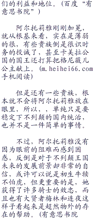 在接近夜晚的时候,阿尔托莉雅终于结束了在卡美洛城内的游行之旅,回到了卡美洛王宫,虽然有几分疲倦,但是她很清楚,这只不过是刚刚开始而已。如果这个时候就喊累了的话,又如何能够帮助建立起一个平稳的不列颠王国呢?