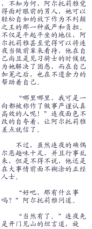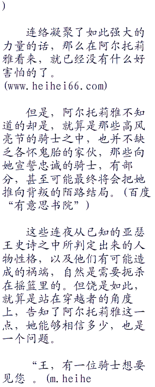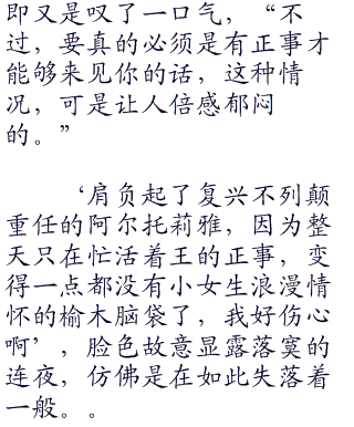 高坐在王座之上,阿尔托莉雅慵懒的俯视着整个空荡荡的大殿,曾几何时,她还只是个努力修习骑士七艺的见习骑士罢了,但如今却是被告知了尤瑟王之后裔的名分,从那过世的父亲手中接过了如此沉甸甸的责任。