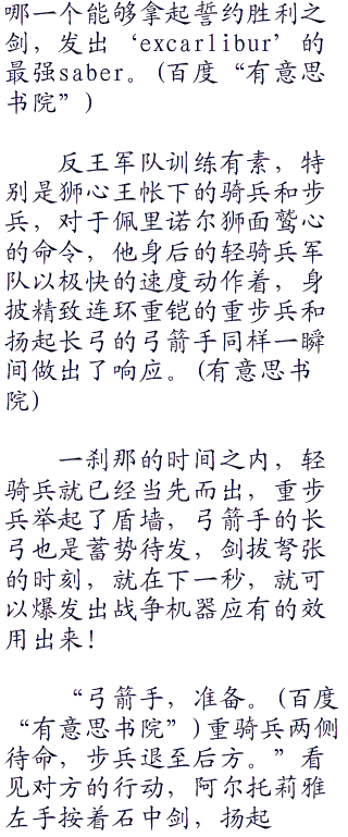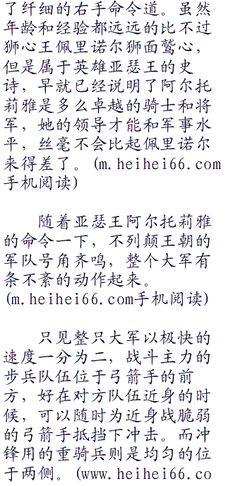 “轻骑兵准备,步兵举盾,弓兵拉弦!”感觉己方的军士在气势上占据了优势之后,佩里诺尔狮面鹫心当即对着身后的军队大声的命令道。有致有序的命令,足可见狮心王壮心不已的优秀骑士能力。