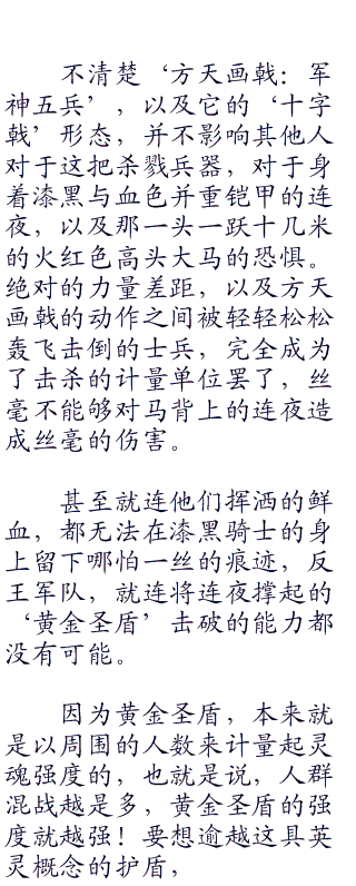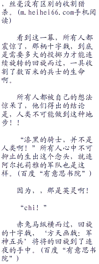 一连串的血肉喷洒和刀剑割肉声响起,那道暗金色的月牙形旋转飞掷而过,宛如死神的终结镰刀般,在飞射中直接贯穿了前方近二十米范围内的骑兵,将数百米名的骑兵、步兵和长弓手生命在一瞬间终结